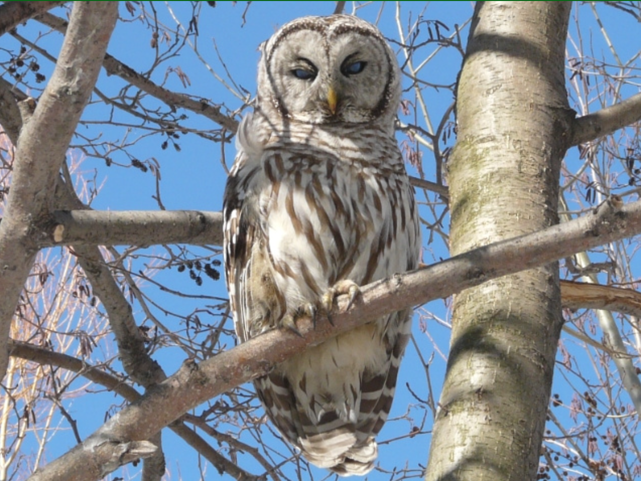 I’ve personally seen the Great Horned Owl and the Barred Owl during spring season at the Rosetta McClain Gardens.