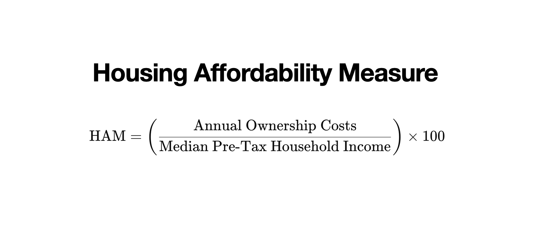 But another widely referenced approach comes from RBC Economics, which calculates housing affordability by determining the proportion of median pre-tax household income needed to cover ownership costs — including mortgage payments, property taxes, and utilities. In this blog post we will stick to the RBC Housing Affordability Measure (HAM) when referring to housing affordability.